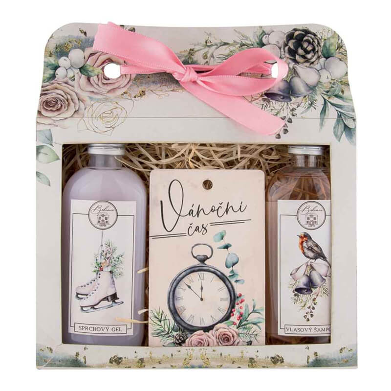 Vánoční kosmetická sada s vůní šípek a růže Vánoční kosmetická sada je krásný voňavý vánoční dárek pro kamarádku, manželku, přítelkyni nebo kolegyni v práci. Vánoční kosmetický balíček obsahuje: - Sprchový gel s extrakty z šípků a květů růže 100 ml - jemný přípravek osobní hygieny vhodný k mytí celého těla, s podmanivou moderní vůní. Je obohacen o kosmetický olivový olej a kvalitní extrakty z plodů šípku (Rosa Canina) a květů růže (Rosa Centifolia), které obsahují flavonoidy, ovocné kyseliny a další prospěšné látky. V kombinaci s kvalitními mycími složkami receptury vznikl přípravek s jemným působením na pokožku. Bohatá pěna je vhodná ke každodennímu použití, šetrně myje a zanechává vaši pokožku svěží a krásně provoněnou. - Vlasový šampon s extrakty z šípků a květů růže 100 ml - vlasový šampon vhodný pro všechny druhy vlasů. Speciální složení přispívá k vysoce kvalitní péči o vlasy, hygieně pokožky a její vitalitě. Přípravek obsahuje extrakty z plodů šípku (Rosa Canina) a květů růže (Rosa Centifolia), které obsahují flavonoidy, ovocné kyseliny a další prospěšné látky, přispívající k šetrnému mytí vlasů a napomáhají je udržovat přirozeně hebké a jemné. Ručně parfémovaná aromatická visačka s motivem Vánoc. Jemná a čistá vůně, která probouzí emoce a vzpomínky.